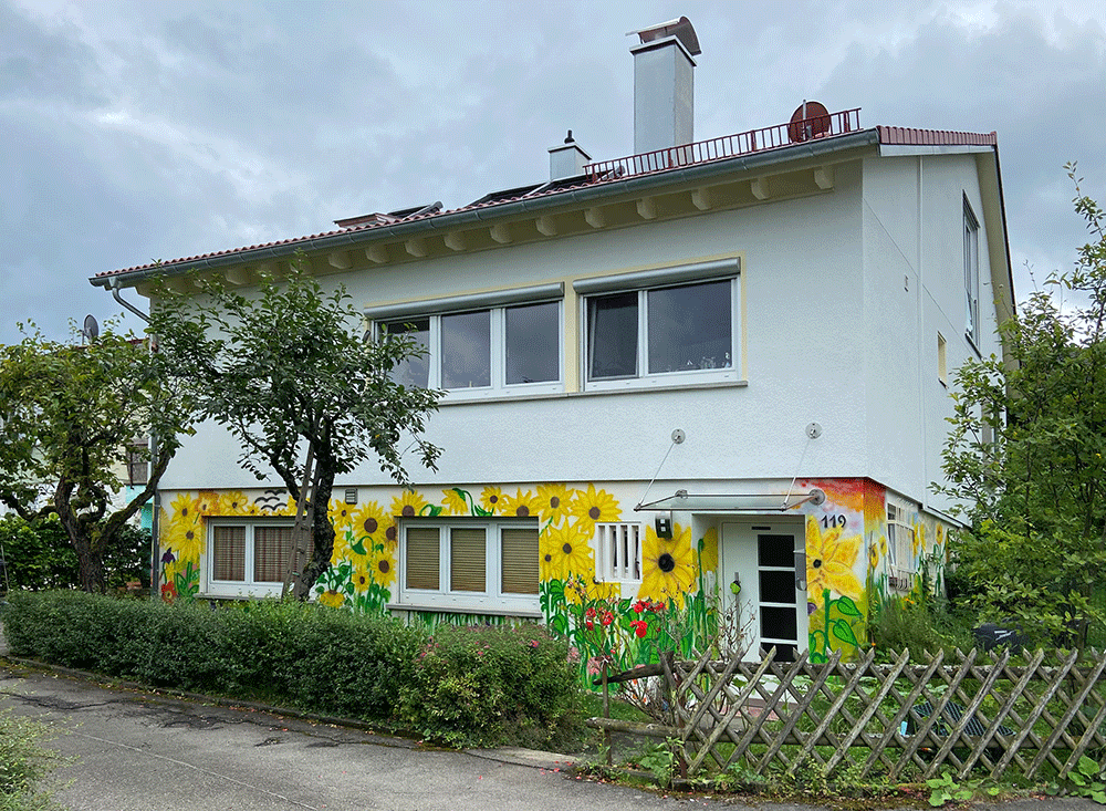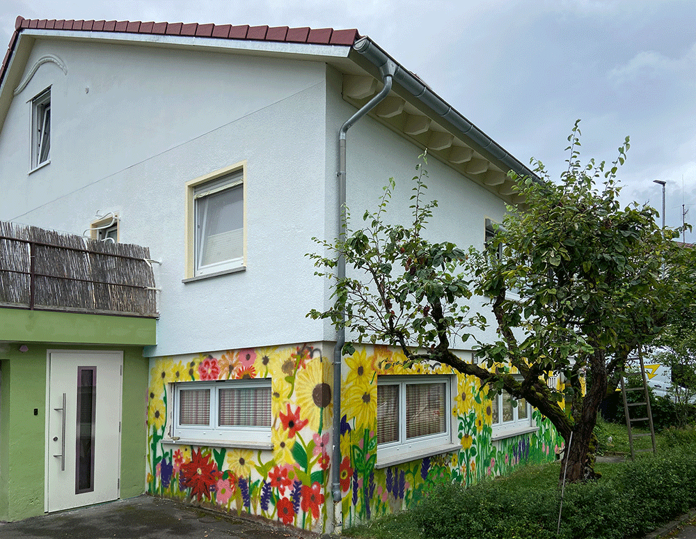 Als der Dachgeschossausbau mit Anhebung der Dachraums genehmigt war, stand meinen Schülerinnen der Laura-Schradin-Schule, 12.Klasse, die Fassade des Gebäudes für ein Graffiti zur Verfügung. Das Thema wurde gemeinsam entwickelt und umgesetzt.